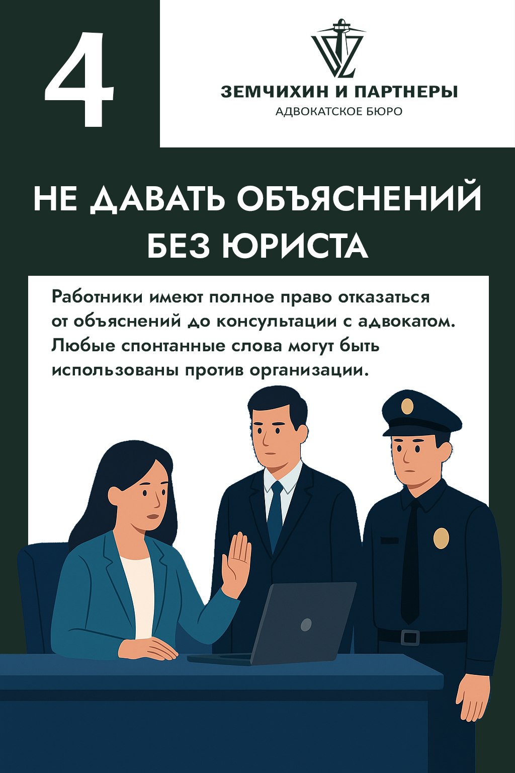 4️⃣ Четвёртое — не давать объяснений без юриста.